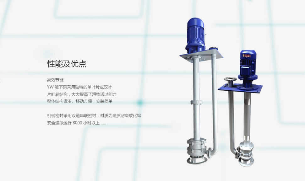 4、液下排污泵機械密封采用雙道串聯密封,材質為硬質耐磨碳化鎢,具有耐用、耐磨等特點,可以使泵安全連續運行8000小時以上。
