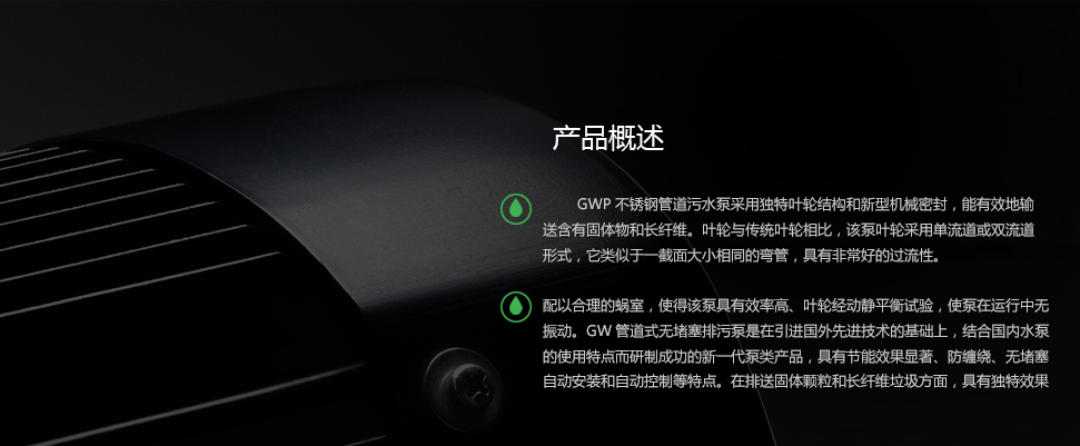 GWP管道泵,耐腐蝕GWP管道泵是在引進(jìn)國外先進(jìn)技術(shù)的基礎(chǔ)上,結(jié)合國內(nèi)水泵的使用特點(diǎn)而研制成功的新一代泵類產(chǎn)品,具有節(jié)能效果顯著、防纏繞、無堵塞、自動安裝和自動控制等特點(diǎn)。在排送固體顆粒和長纖維垃圾方面,具有獨(dú)特效果