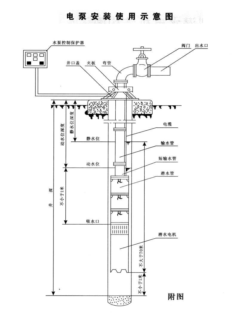 1.QJ型深井潛水泵機組由:水泵、潛水電機(包括電纜)、輸水管和控制開關(guān)四大部分組成。潛水泵為單吸多級立式離心泵:潛水電機為密閉充水濕式、立式三相鼠籠異歩電動機,電機與水泵通過爪式或中.鍵筒式聯(lián)軸器直接;配備有不同規(guī)格的三芯電纜:起動設備為不同容量等級的空氣開關(guān)和自耦減壓起動器、輸水管為不同直徑的鋼管制成,采用法蘭聯(lián)接,高揚程電泵釆用閘閥控制。