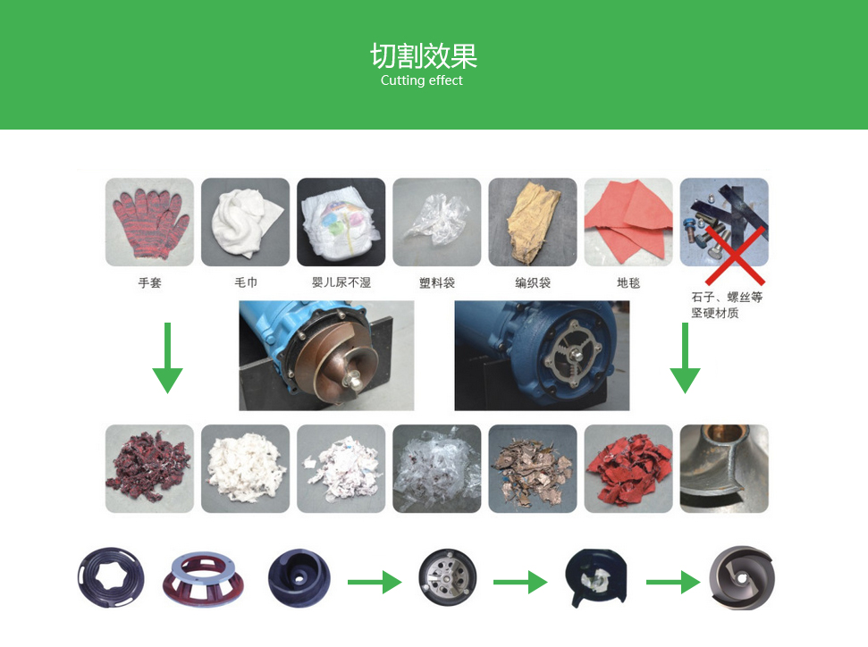 ①采用獨特的單葉片或雙葉片葉輪結構,大大提高了污物通過能力,能有效的通過泵口徑的5倍纖維物質與直徑為泵口徑約50%的固體顆粒。