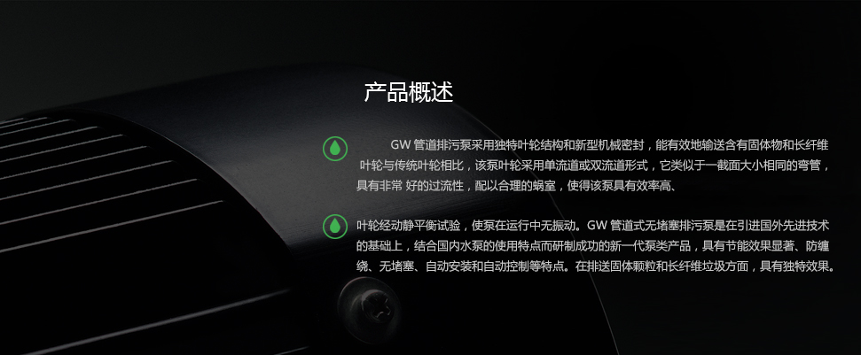 GW管道排污水泵是在引進國外先進技術(shù)的基礎(chǔ)上,結(jié)合國內(nèi)水泵的使用特點而研制成功的新一代泵類產(chǎn)品,具有節(jié)能效果顯著、防纏繞、無堵塞、自動安裝和自動控制等特點。在排送固體顆粒和長纖維垃圾方面,具有獨特效果